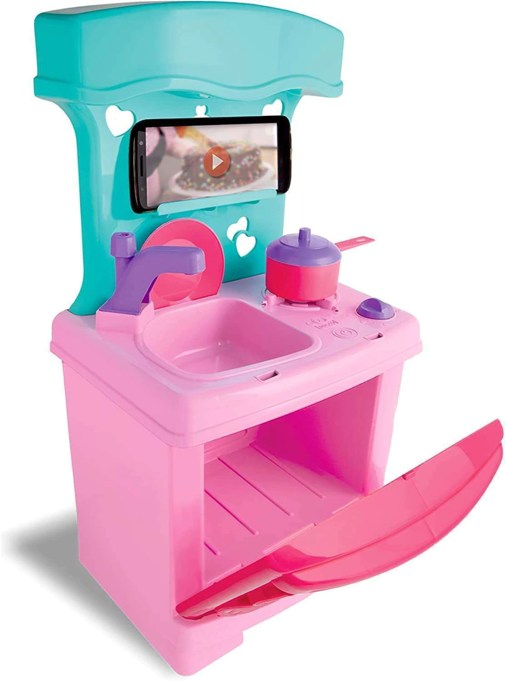 Com seu designer diferenciado, todo estiloso e moderno, também possui suporte para celular. A cozinha tem uma torneirinha lúdica, um cooktop, utensílio e pratinhos. Uma brincadeira para passar o dia se divertindo!